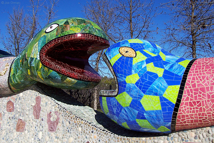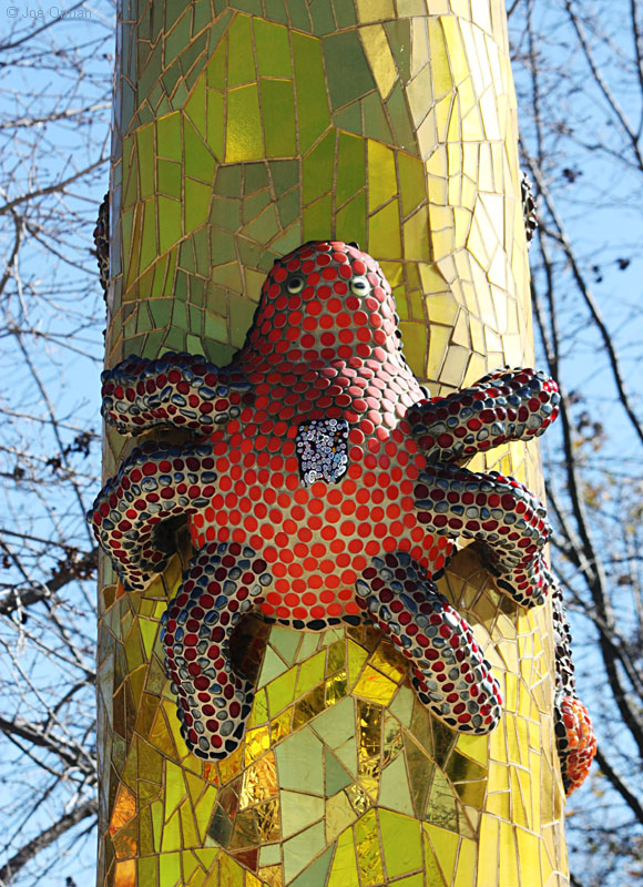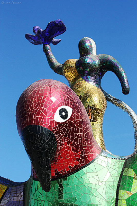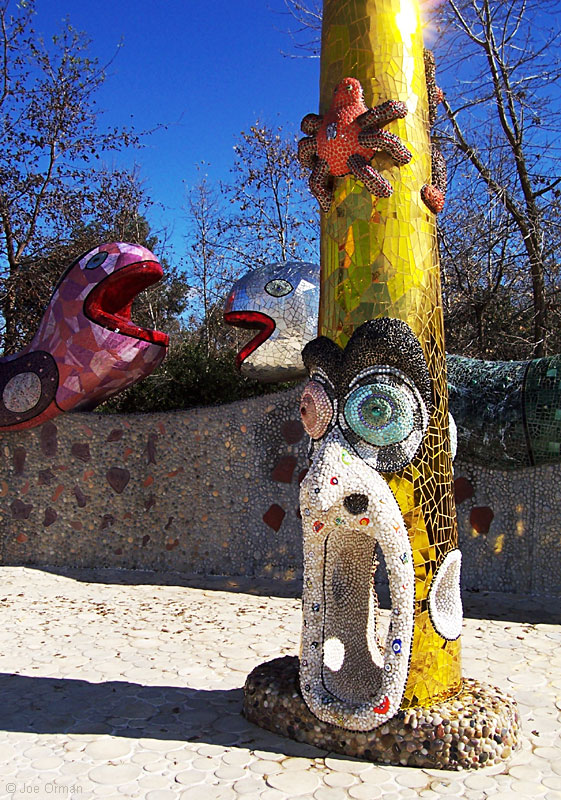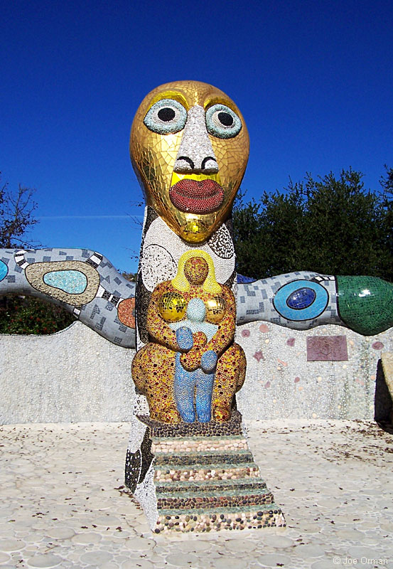 Queen Califia was "a legendary Black Amazon Warrior Queen believed to rule a terrestrial island paradise of gold and riches." Artist Niki de Saint Phalle used colorful tile, glass, shells and stones to create the queen and her fantastic creatures. A sign at the entrance to the sculpture garden gives the history of the artist and the project: