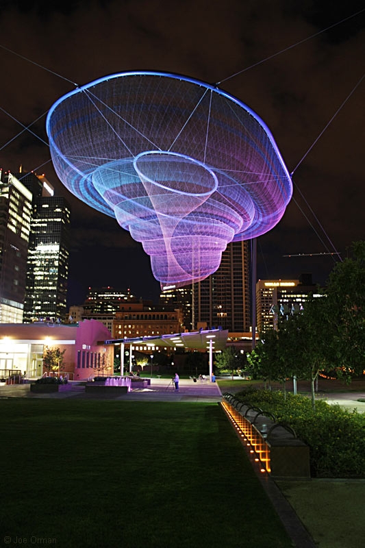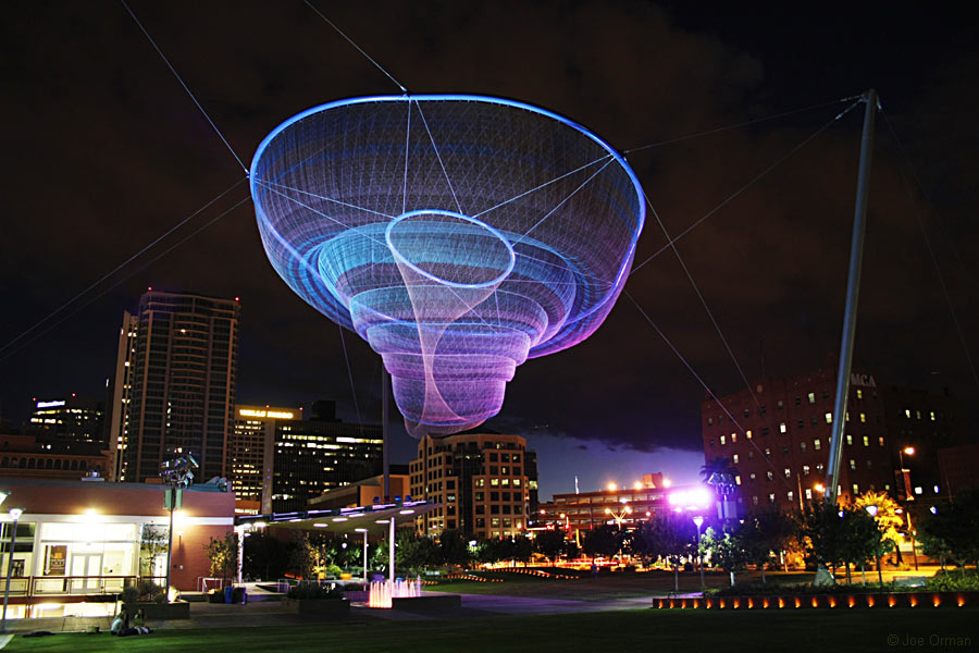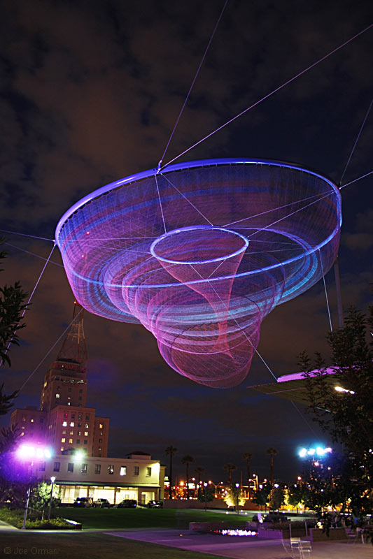 So far, I've resisted adding public artworks to these Bizarre Backroads pages; there's just so much bizarre public art these days, I wouldn't know when to stop! But this particular piece of art has generated so much controversy that I can't resist. The working title was "Sky Bloom," and the shape was said to be inspired by a saguaro cactus flower, the Arizona state flower. But even before it was installed, the design elicited somewhat more derogatory comparisons: ... "a jellyfish" ... "a tornado" ... "a mushroom" ... "a spaceship" ... "a waste of money." Since the tab was $2.4 million, that last comment is understandable. For that price, Phoenix taxpayers got 600 pounds of plastic netting attached to huge steel rings and suspended by cables above a downtown park.