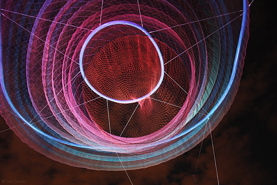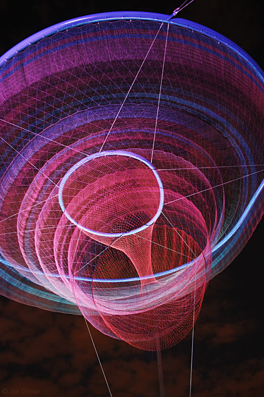 When the netting was finally raised in the spring of 2009, the artist (Janet Echelman) revealed the actual name of the artwork: Her Secret Is Patience. This phrase was taken from an essay by Ralph Waldo Emerson: "Leave this military hurry and adopt the pace of nature. Her secret is patience." Perhaps I didn't have enough patience when I visited in the daytime (see photo above), because my impression was the same as the reviewer who compared it to "a drab, heavy fisherman's dragnet." But the piece must be seen after sunset to be fully appreciated; as twilight falls the netting beautifully transforms, glowing orange and purple (the team colors of the Phoenix Suns) against the dark sky (see photos below).