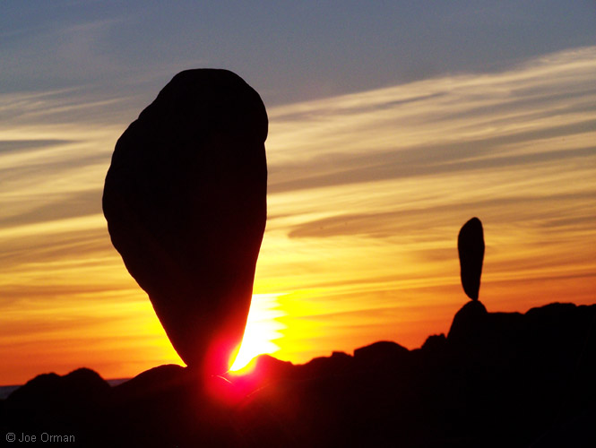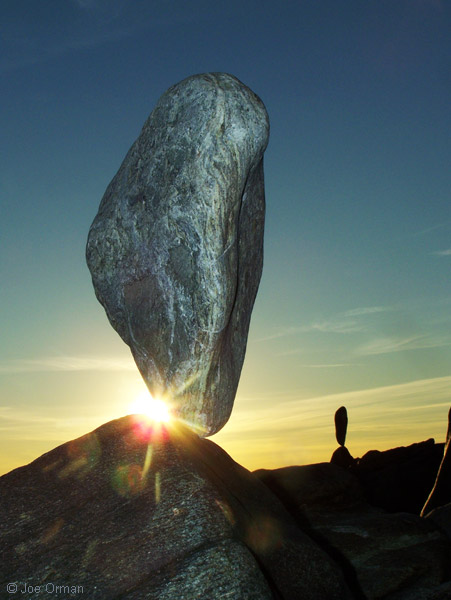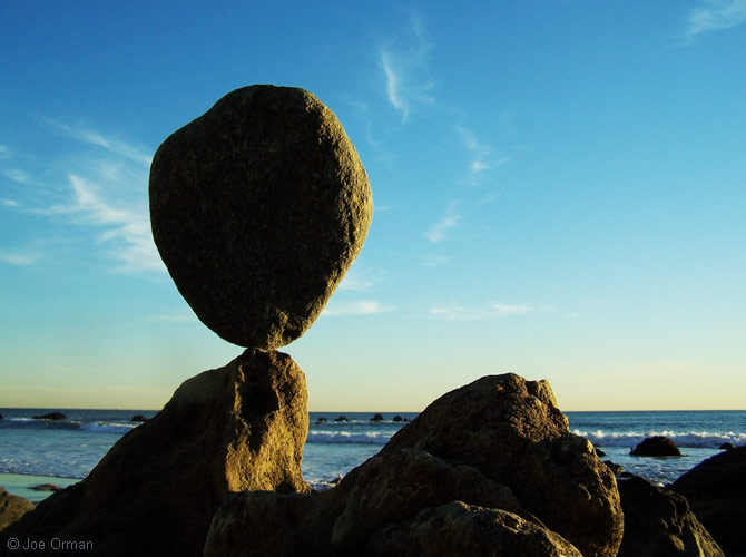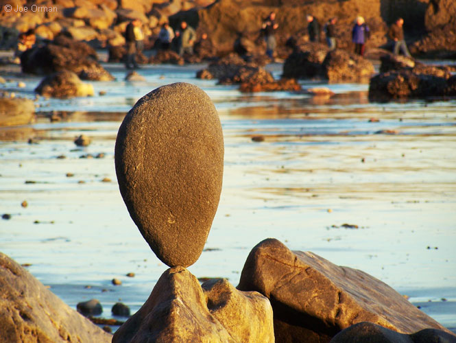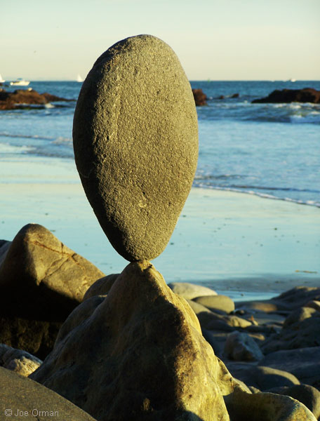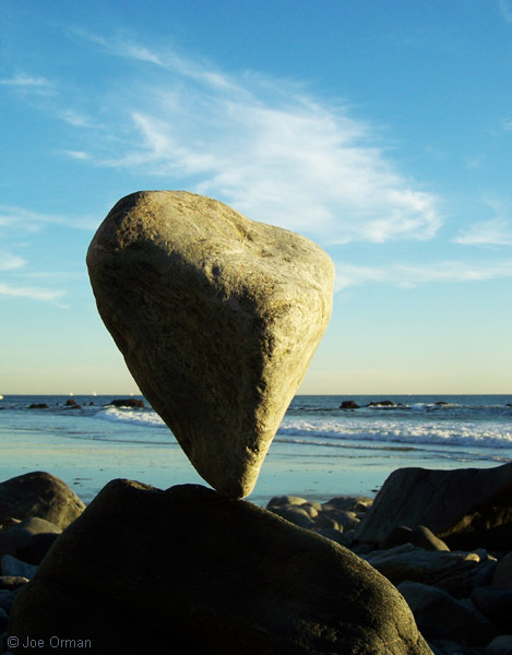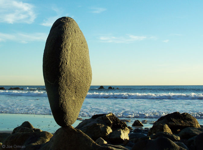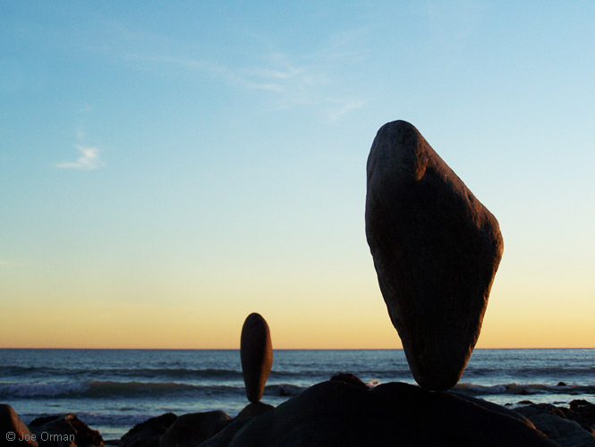 "This is what I do when there's no surf," he said by way of explanation. As I watched him at work, the rational part of my mind boggled at his skill -- the stones, some weighing many tens of pounds, were perfectly balanced on tiny, nearly-invisible imperfections in their surfaces. I saw an artist immersed in the joy of creation; if there was any struggle, it was a struggle to reach a point of perfection. As we spoke, I expressed my gratitude for the unexpected joy this reworking of the natural elements had brought me; in the late afternoon light, with the eternal sea for a background, another part of my mind saw in the stones a deep and mysterious beauty. Like all art, they celebrate the miracle of existence while recognizing the sadness of its transience. And like all standing stones placed since culture's very beginning, they stir forgotten echoes of our ties to the land and sky. Eventually I noticed that the artist had slipped away; as the sun set and the light faded, I myself turned to leave -- and dared not look back.