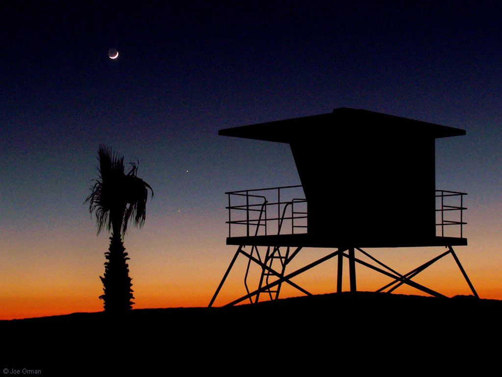 Moon above palm, Jupiter and Mercury between palm and life guard shack.