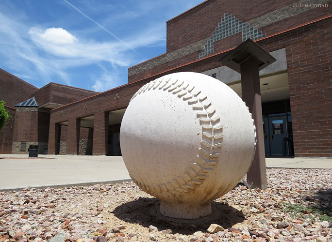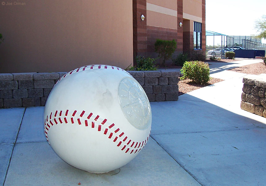 Several giant baseballs can be found along the entrance walkways to the Peoria Sports Complex. All of the ones shown here are outside the complex fence, except for the pair in the grassy area which are just inside the fence.