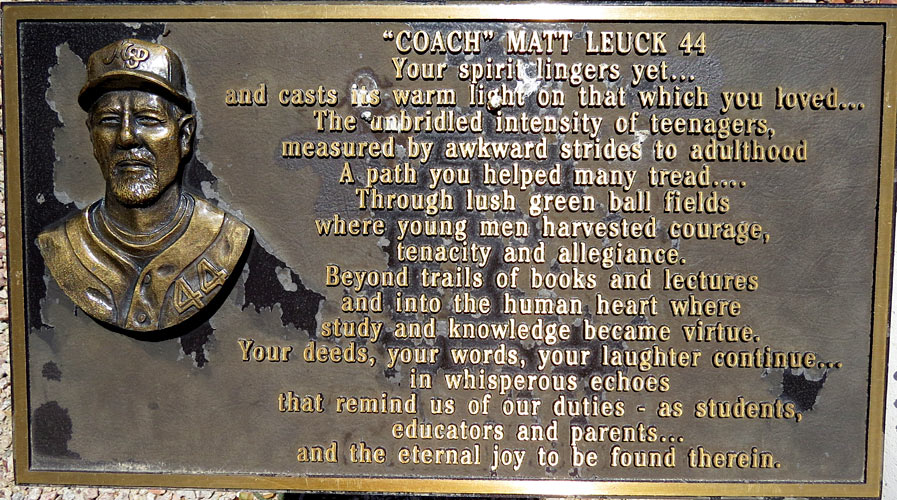 A plaque next to this giant baseball is dedicated to "Coach" Matt Leuck.