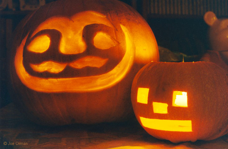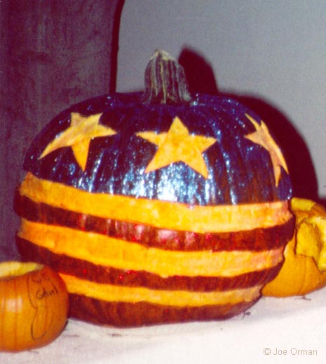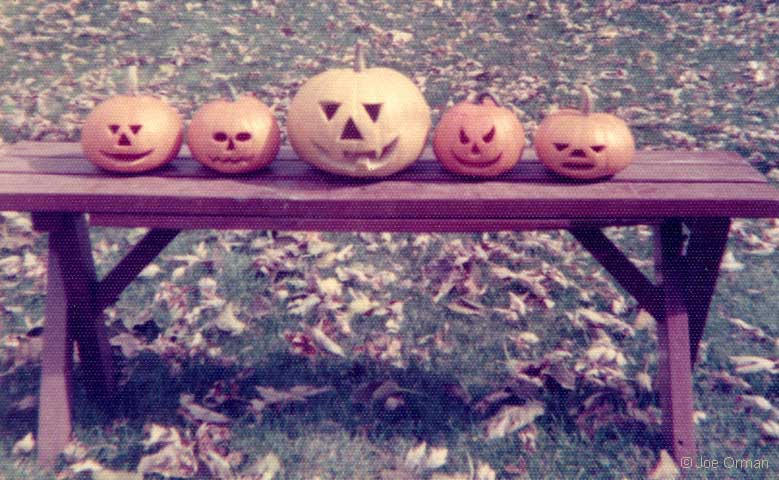 I think this was my cleverest design; I carved the pumpkin with diagonal cuts which DID NOT REMOVE ANY OF THE SHELL! The eye, nose and mouth holes were created by sliding the sections apart, then inserting blocks of orange gelatin. I had blueprints! This was voted the top prize at Mike Orman's infamous annual pumpkin-carving party that year. I don't think I ever won again after that; I personally believe I was blacklisted because this first design was so darn good everyone was jealous for years!