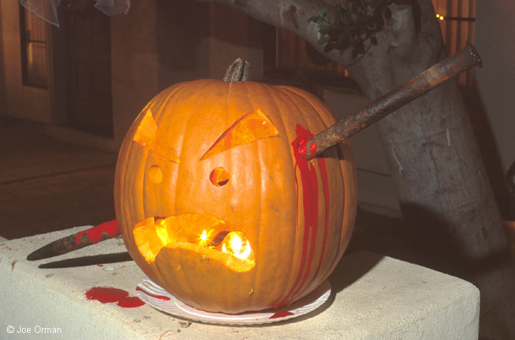 The torch has been passed to the next generation! This year's design and carving is by Kelly Orman. Note the "brains" leaking out from the cracked helmet! Lit by an external light bulb.