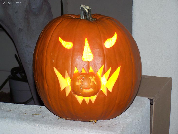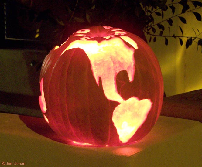 Conceptual design and small-pumpkin carving by Heather Orman. Again, lit from within by a 60W light bulb.