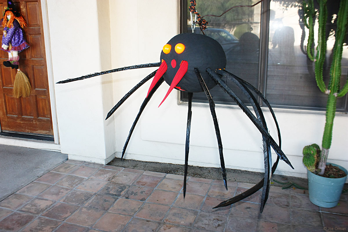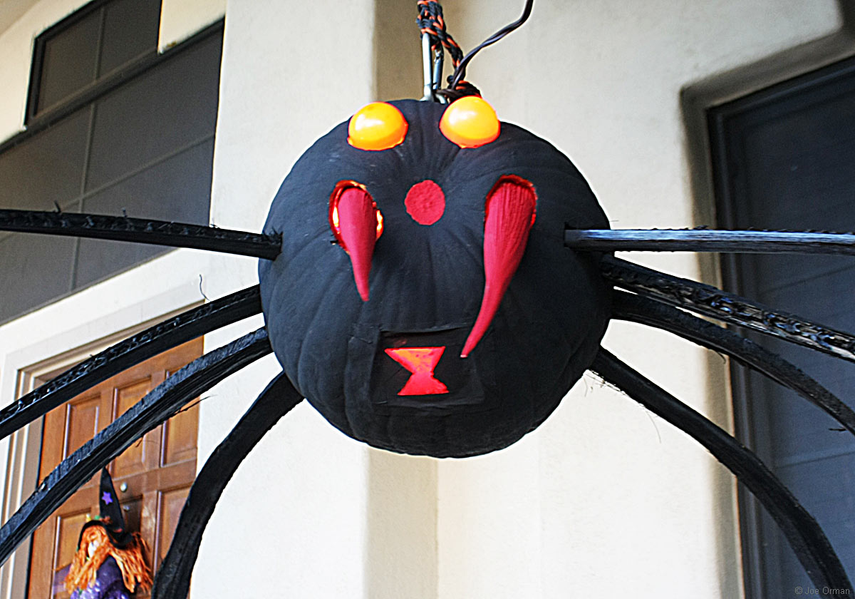 Halloween fell on a Sunday this year, so I had a bit more time to work on my pumpkin and got really ambitious! The design was inspired by a metal spider sculpture made from a Volkswagen Beetle that I had photographed earlier in the month. Instead of a VW, I used a pumpkin (painted black) for the spider body. The legs and fangs are carved from fronds that I trimmed from my palm trees, painted black and red; the eyes are orange plastic Easter eggs. Again, lit from within by a 100-watt light bulb.