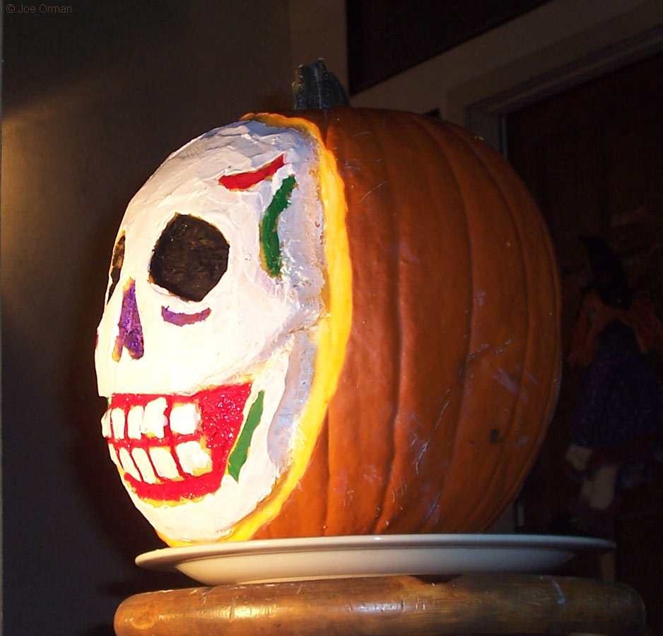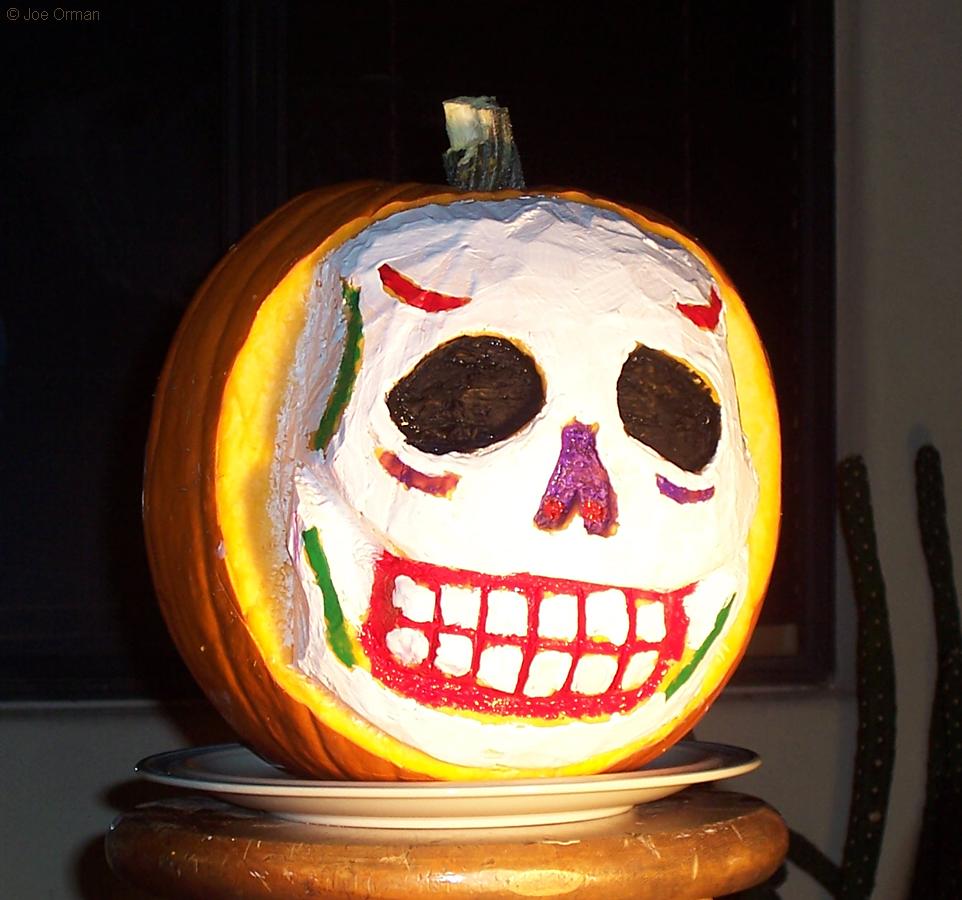 Día de los Muertos ("Day of the Dead") is a traditional Mexican celebration to remember the dead and to honor ancestors. This pumpkin design is inspired by the skull masks that some participants wear. All the carving and painting was done on the outside of the pumpkin, which was then lit by an external light bulb.