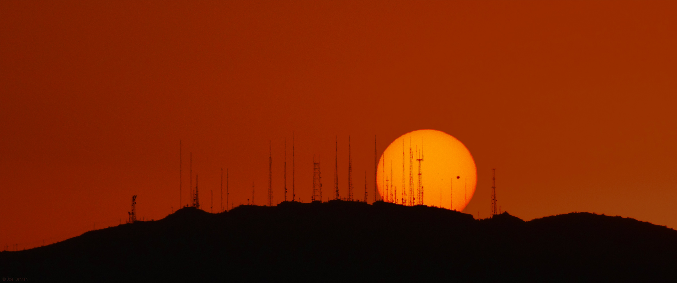 In the rare occurance known as a transit of Venus, the orbits of Earth and Venus bring them in direct alignment with the sun, making Venus appear as a small black dot moving slowly across the bright face of the sun. So infrequent is a transit of Venus that the next one will not occur until the year 2117! I photographed this transit from a location in Chandler where the sun aligned with the towers on Phoenix's South Mountain just before it set. In this telephoto image, the towers, Venus and Sun appear close together, but each are at radically different distances from the camera: